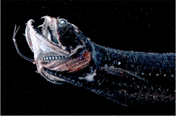 Mulutnya yang besar siap menerkam dan rahangnya yang bergigi panjang dan mengarah ke dalam membuatnya mudah memasukkan mangsa ke perut sekaligus menutup jalan keluar dari mulutnya. Predator mieip mesin ini mampu membesarkan rahang dan perutnya sehingga mangsa yang lebih besar dari dirinya bisa masuk ke dalamnya. Hantu lautan ini dapat ditemukan di kedalaman 3.300 hingga 6.600 ft di bawah lautan. O, ya, panjangnya bisa mencapai 2 ft.
